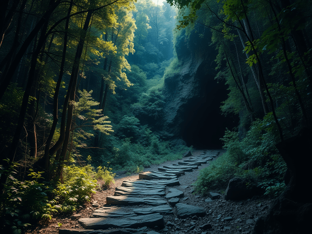 So on they went, and the path meandered around a shallow brook that eventually led to the mouth of a deep cave. Here, the path diverged into three directions; one path traveled northwest into a hollow; another northeast directly into the cave; and the third aimed southeast, up a steep, muddy incline on the mountain pass again.